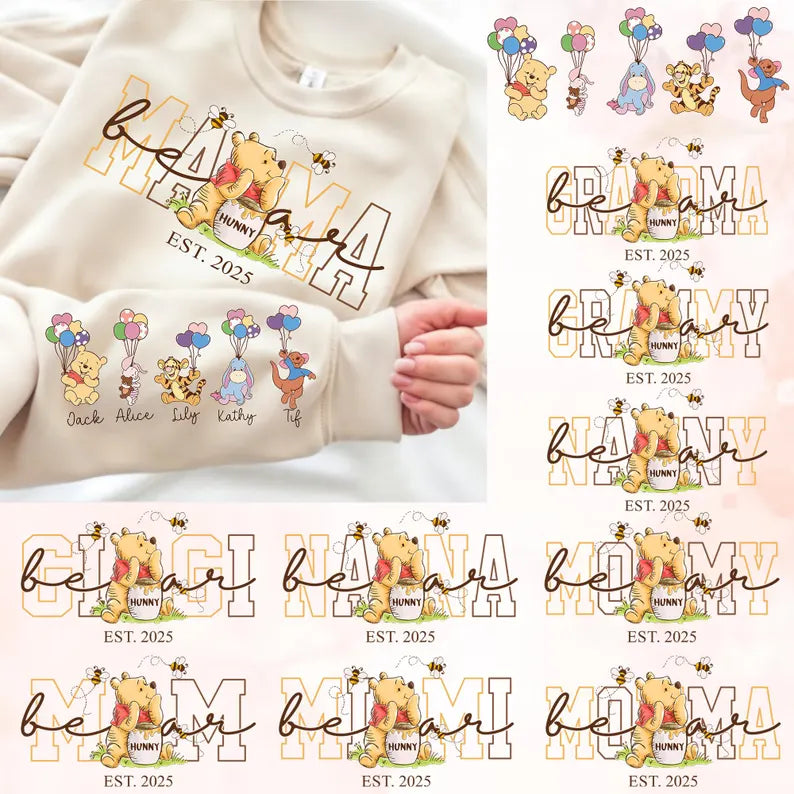 Mama Bear with children's names on the sleeve. Please state what characters you want for each name or we will pick for you if note is not added, choice of bear, pig, donkey, tiger or kangaroo.