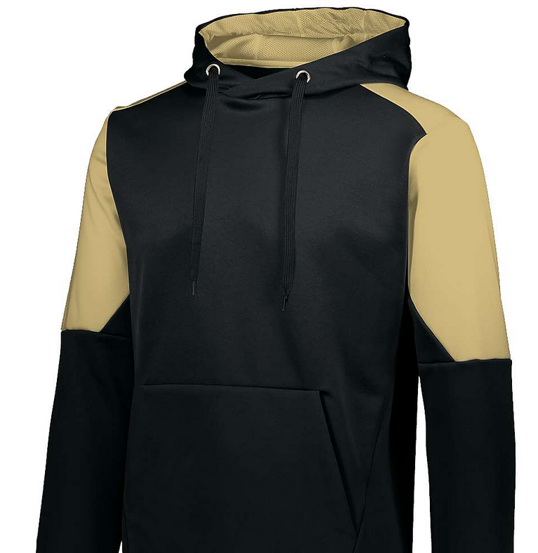 Holloway Blue Chip Hoodie. Dry Excel 5.9 Ounce 100% polyester performance wicking fleece with color secure technology that helps prevent dye migration. Wicks moisture. Tagless label. 3 piece hood with lightweight mesh lining. Set-in sleeves. Front pouch pocket. Self-fabric cuffs and bottom band.