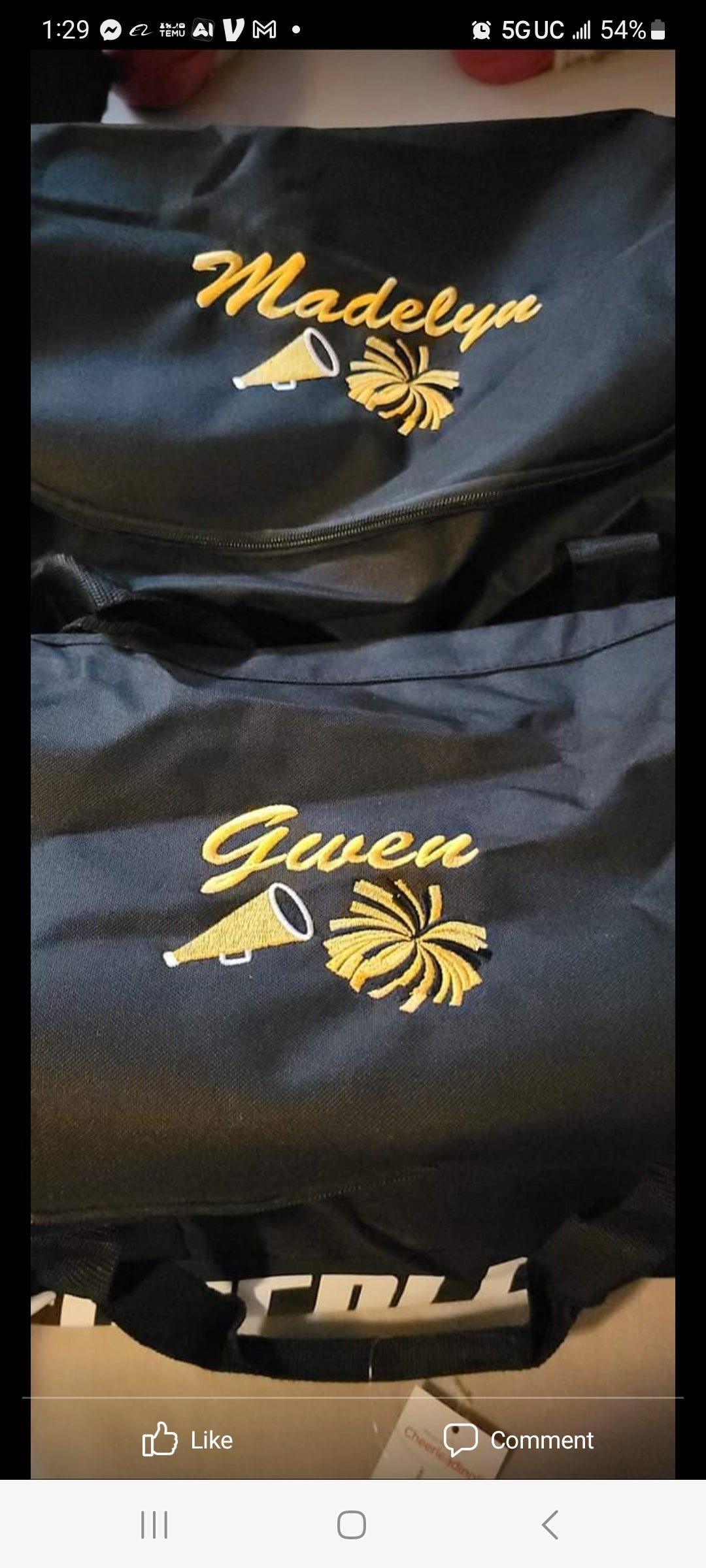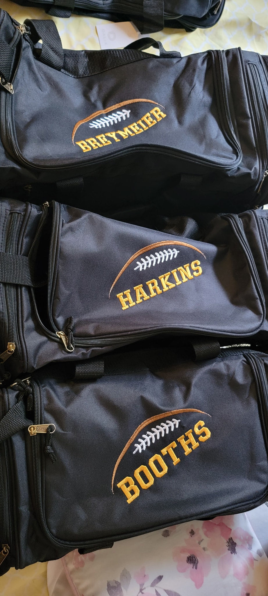 Bags are embroidered with names and either a football design or cheer design. Please be sure to specify which you would like. Name can be Last, First or nickname!