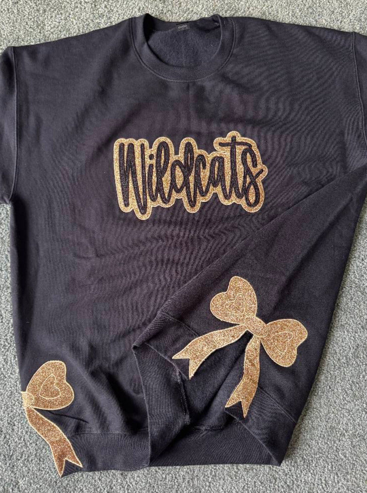 Gildan soft style crewneck in choice of Sand or Black with Wildcat and side bows embroidered with vinyl glitter.