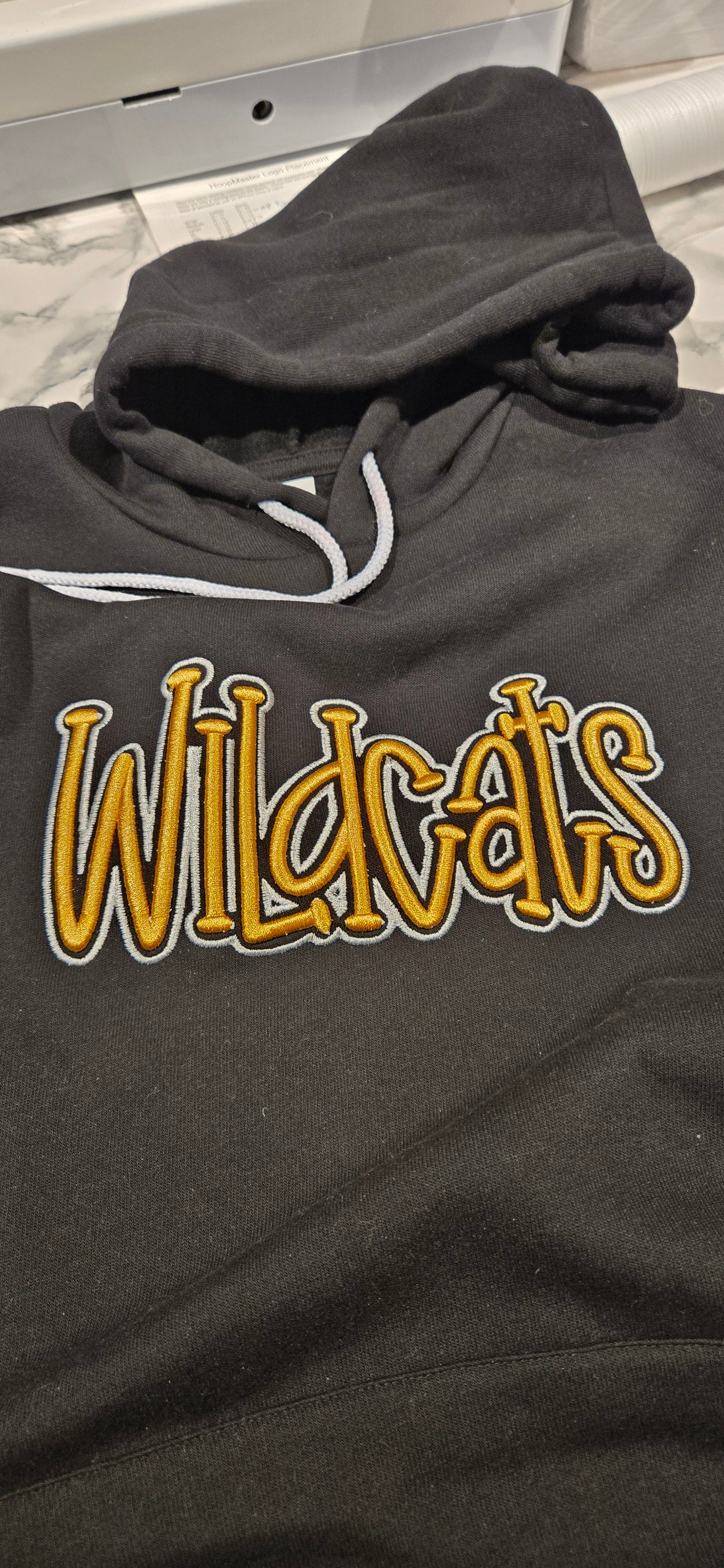 Black hoodie with a puff embroidery design saying Wildcats.