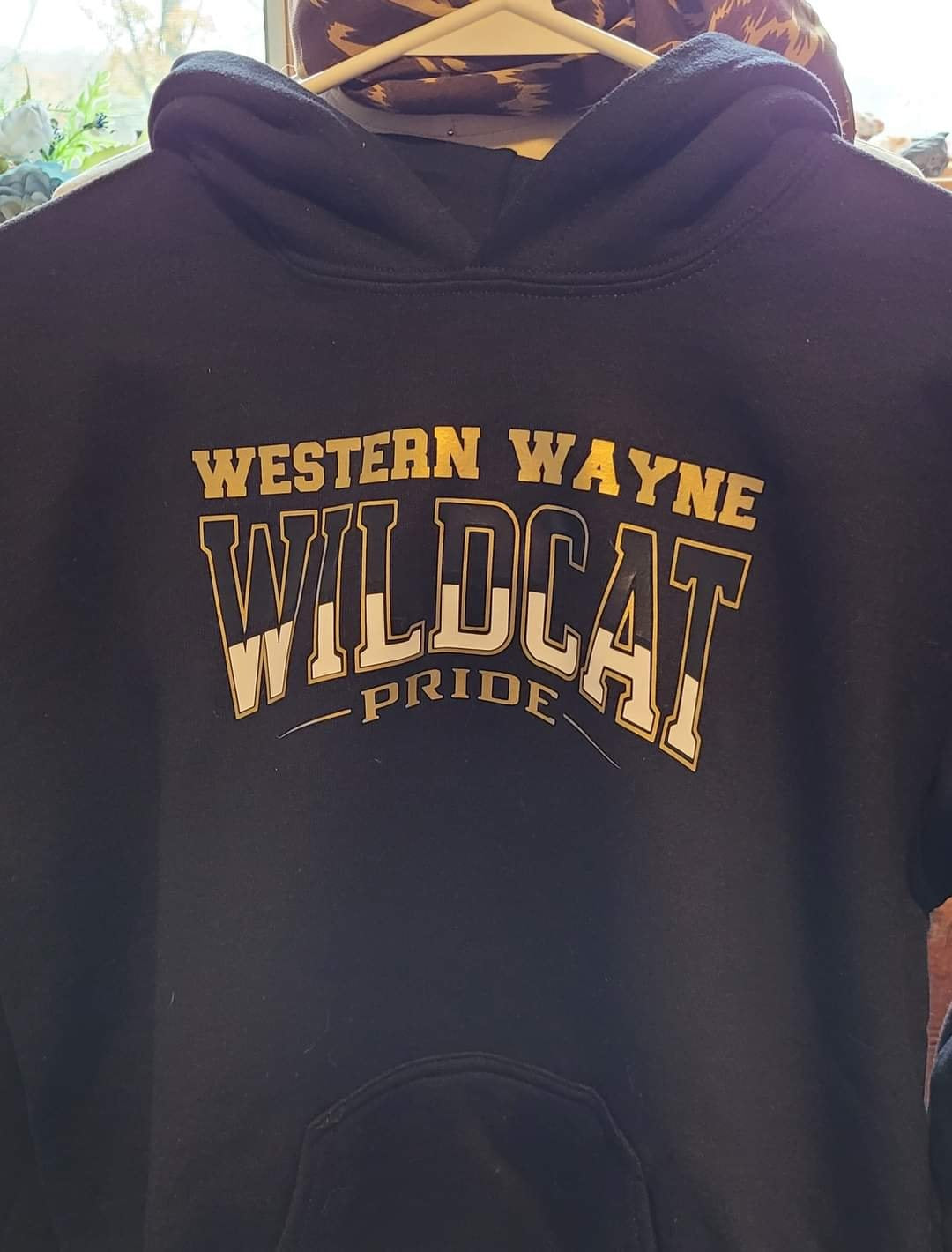 Black hoodie with the Western Wayne Wildcat Pride design in Youth and Adult sizes.